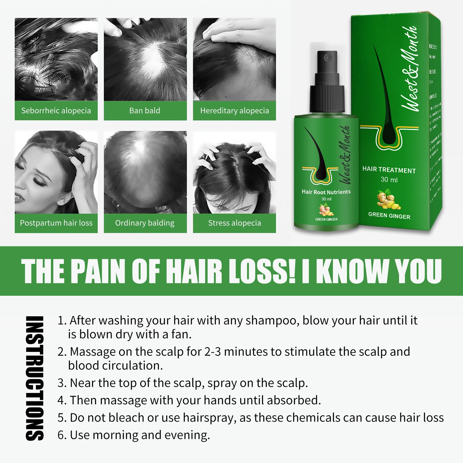Suero para el crecimiento del cabello a base de hierbas con extracto de jengibre de WEST & MONTH: fórmula anticaída del cabello: compre 3 y pague 2