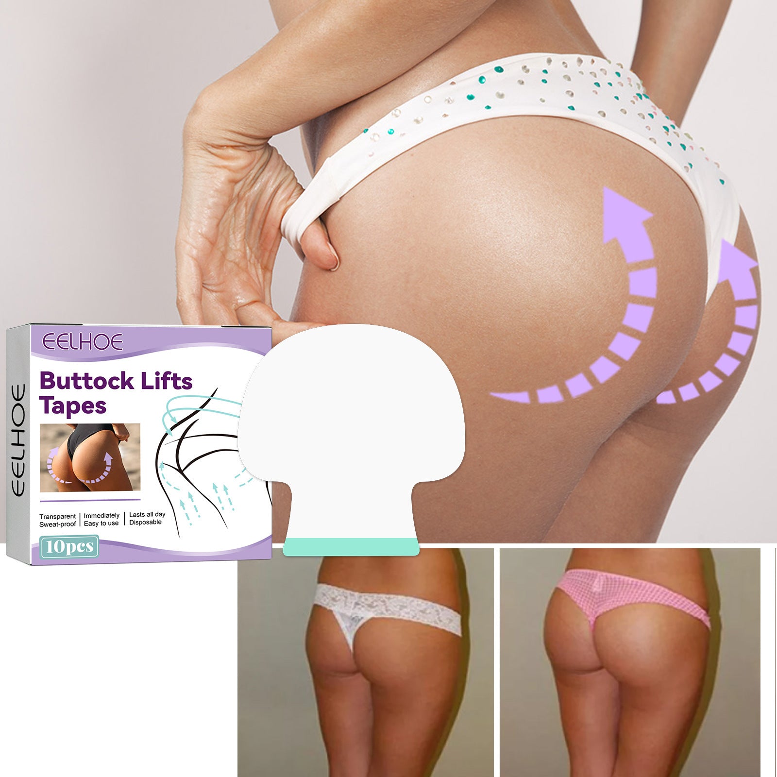 Brand: EELHOE Product: Butt Lift Tapes Material: Flexible and skin-friendly material Color: Transparent Package Contents: 10 pieces butt lift tape Features: Instant butt lift and shaping Sweatproof and water resistant Adhesive and stays in place Easy to use Disposable Invisible under clothing Suitable for all skin types