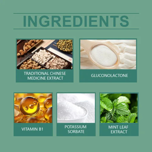 Ingredients: traditional Chinese medicine extract, gluconic acid lactone, vitamin b1, potassium sorbate, mint leaf extract.
