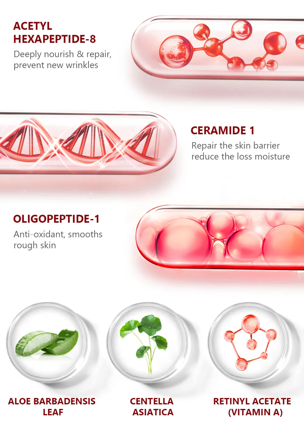 - Ingredients: Hexapeptide, hyaluronic acid, collagen, vitamin E, niacinamide.