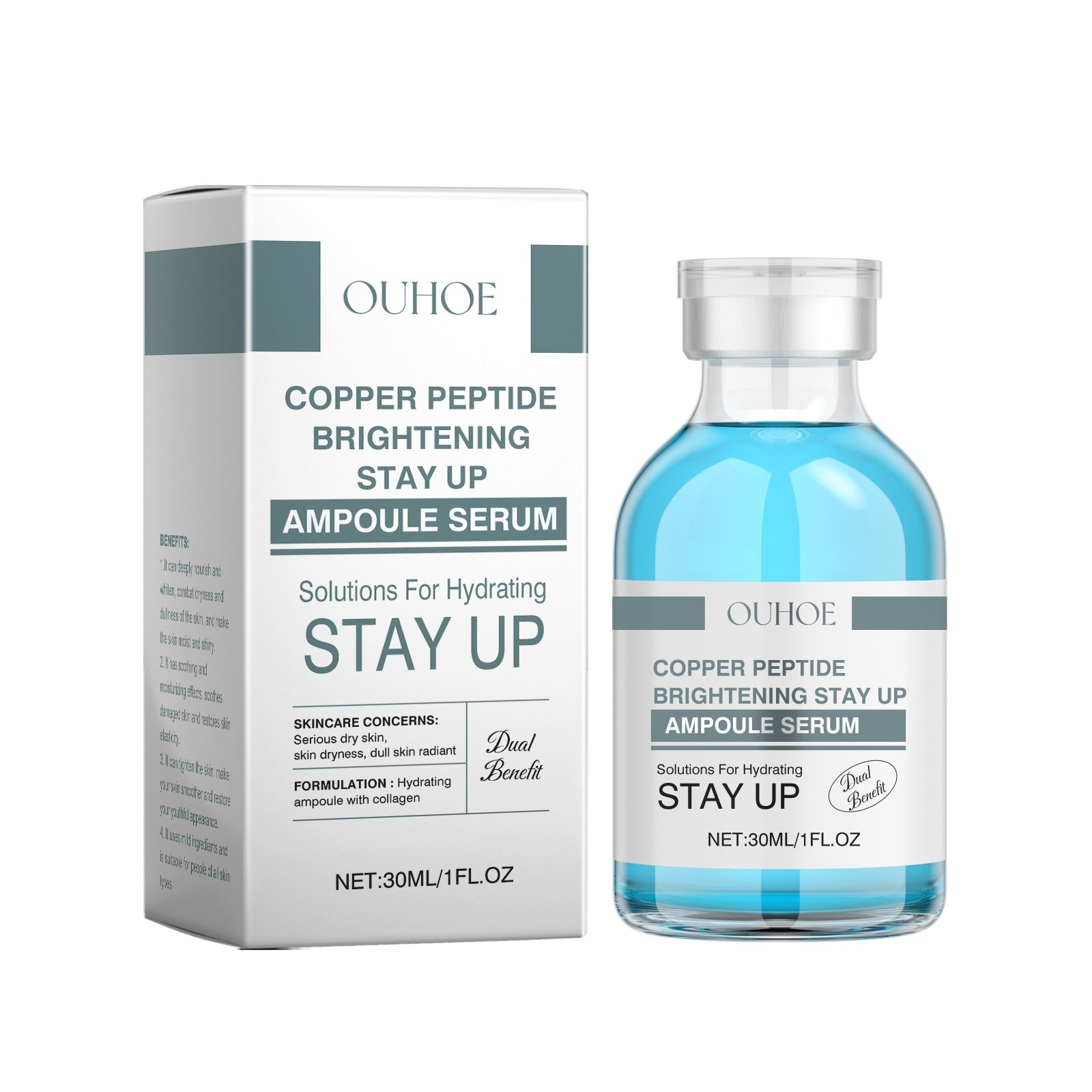 Transform your complexion with OUHOE Copper Peptide Brightening Stay Up Ampoule Serum, an advanced hydrating solution designed to revitalize dry, dull, and lackluster skin. This potent serum harnesses the power of Copper Tripeptide-1 and Collagen to not only deeply hydrate and restore moisture levels but also actively support the skin's natural collagen production for a plump, youthful look. Experience a noticeable brightening effect as it improves skin texture, enhances elasticity, and shields your skin from daily stressors, revealing a radiant, softer, and smoother complexion.