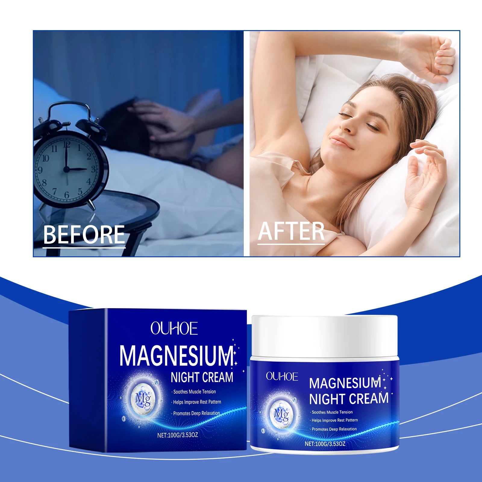 Ouhoe Magnesium Night Cream is a skincare product enriched with magnesium, which deeply nourishes and rejuvenates your skin, giving it a younger and healthier appearance. It plays an active role in the skin's renewal process, especially during sleep, ensuring you wake up with a more refreshed and radiant complexion.
