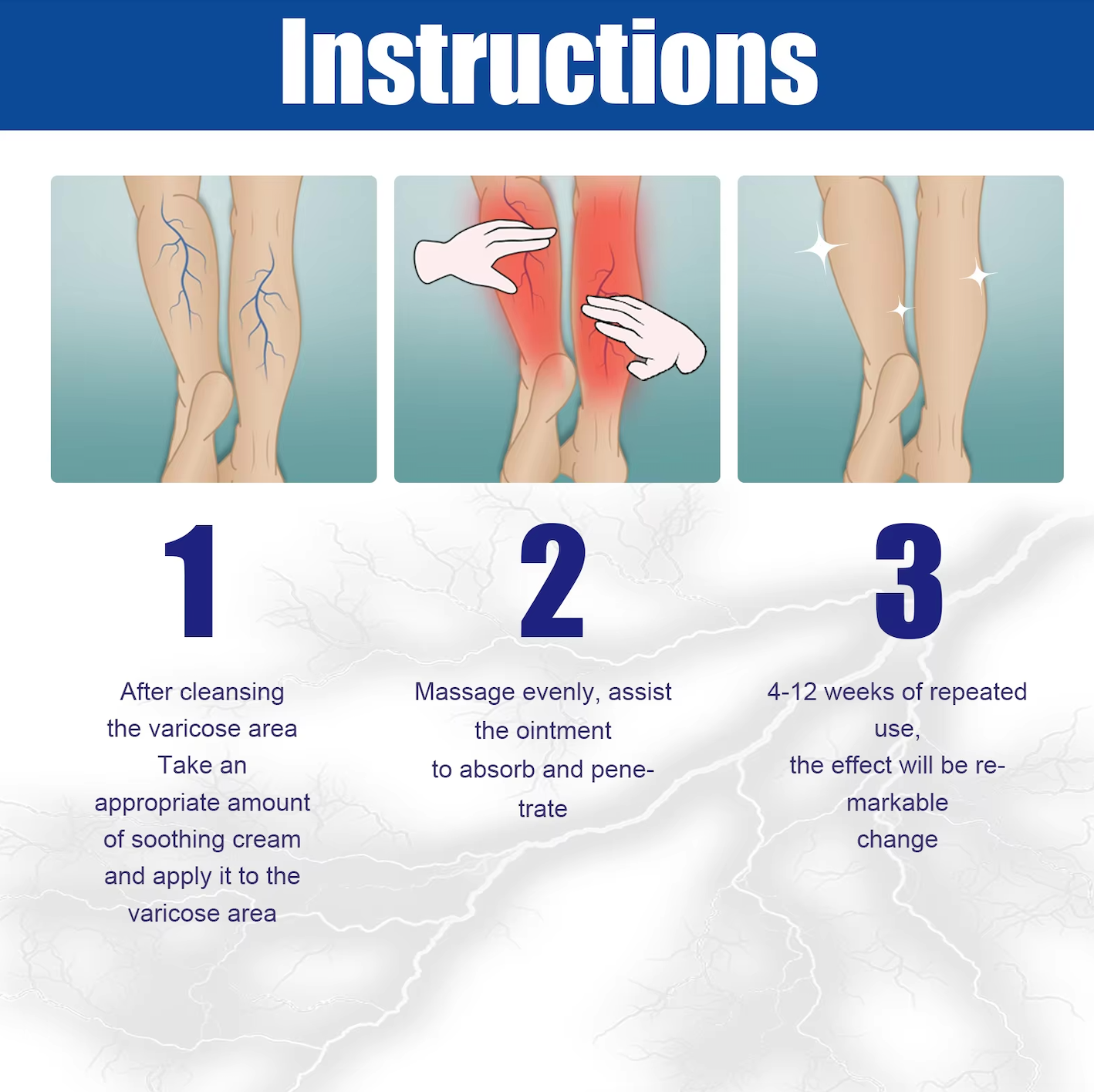 1. After cleansing the varicose area,take an appropriate amount of soothing cream and apply it to the varicose area.