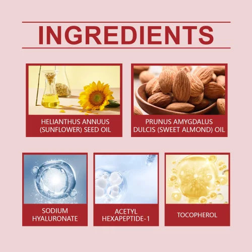 Material: acetyl hexapeptide -1, sodium hyaluronate, tocopherol (vitamin E), sweet almond oil, sunflower seed oil.